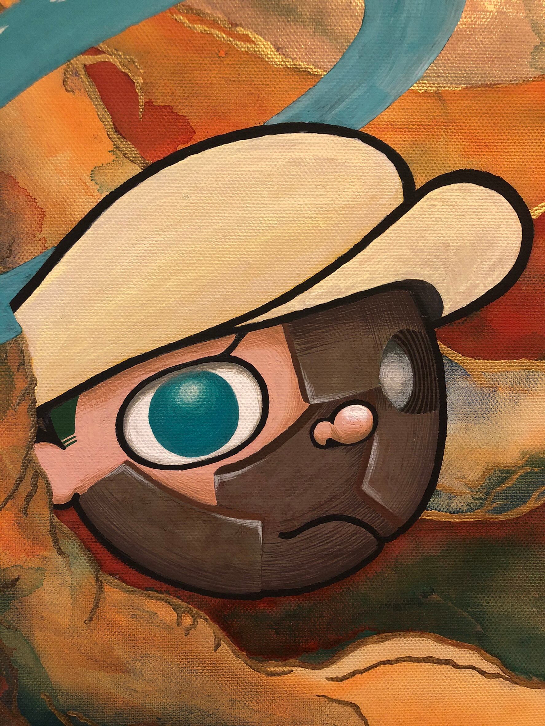 巨樹の根元に無造作に転がったサイボーグの頭部…イラスト的なモチーフを写実性のあるタッチで宮﨑が得意とする、滲みと細部にまで拘った繊細で色彩豊かな作品です。
